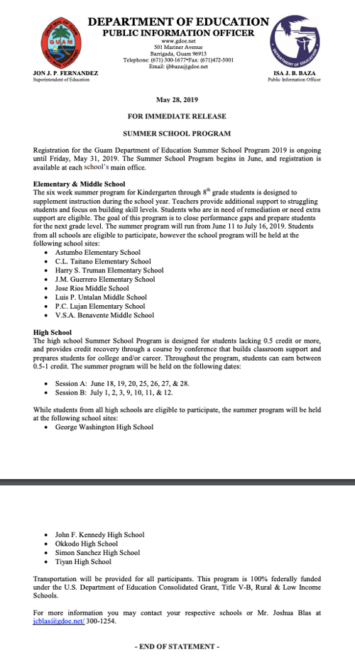 Gdoe Summer School Registration Ends Friday May 31 Guam News