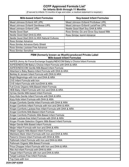 Ccfp Approved Formula List Coordinated Child Care Of Pinellas